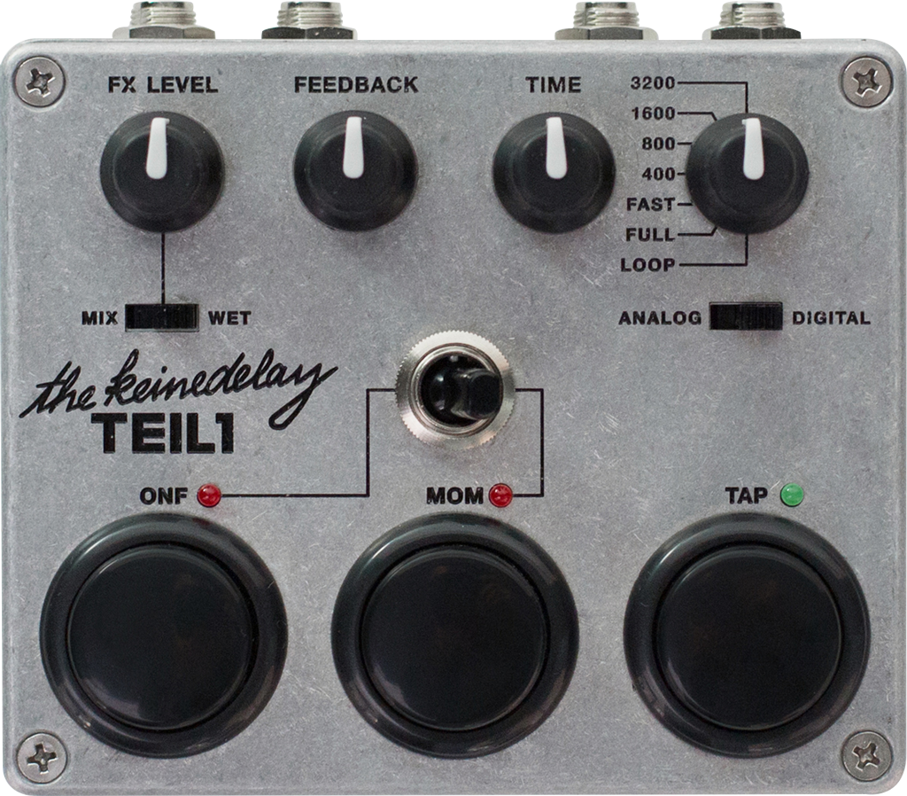 Die obere Hälfte des Layouts ist mit vier Potentiometern klassisch gehalten und ähnelt der von anderen Delays wie z. B dem Boss DD-7. Mit dem FX-Level-Regler lässt sich die Lautstärke des bearbeiteten Signals verstärken, mit dem Mix/Wet Schalter kann man wählen, ob das Eingangssignal dem Ausgangssignal beigemischt wird oder nicht.