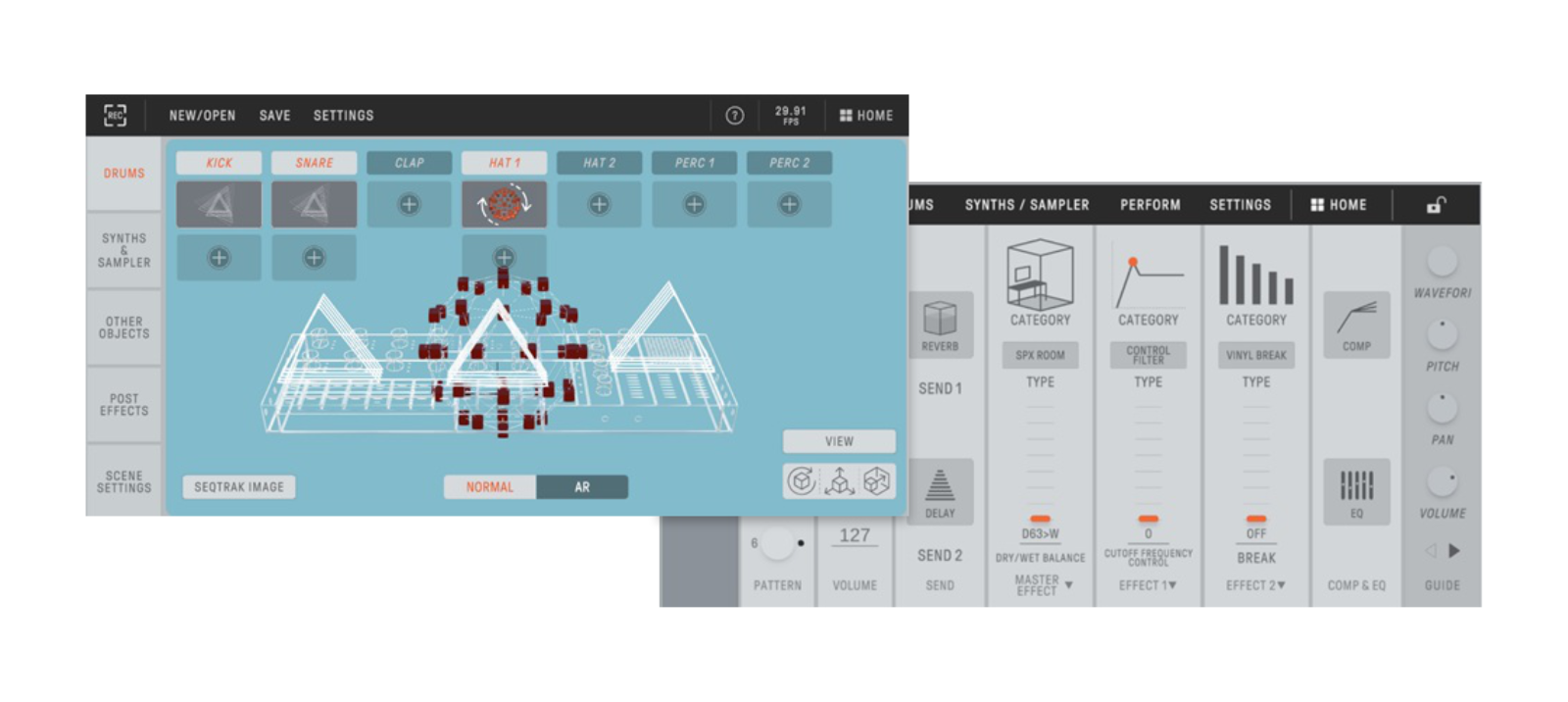 Mit der kostenlosen SEQTRAK-App lassen sich noch mehr Features von Yamahas kompakter Groovebox bedienen. Der Funktionsumfang der App bezieht sich vorwiegend auf vier Kategorien: das Verwalten von Sounds und Projekten, tiefgreifende Optionen für Sounddesign, dynamische Tutorials und der Visualizer. Letzterer ist eine ziemlich innovative Ergänzung zum Funktionsumfang des SEQTRAK und generiert 3D-Objekte oder visuelle Effekte, die in Echtzeit auf die Performance reagieren. Beispielsweise können alle der 11 Tracks mit unabhängigen Visualisierungen verknüpft werden, die sich in Sachen Form und Bewegung programmieren lassen.