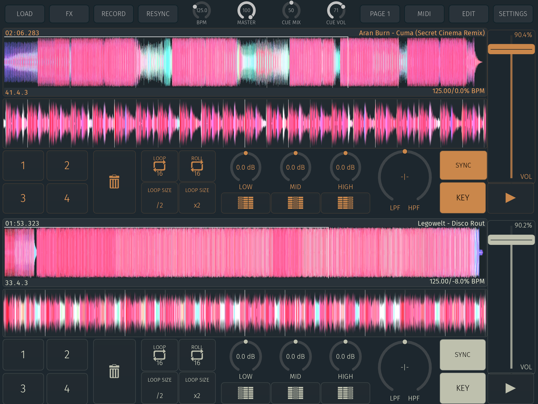 Lädt man Songs in die Decks, werden diese analysiert und mit Beatgrids überzogen. Diesen Vorgang erledigt die App in den meisten Fällen zuverlässig, nur bei Songs mit komplexen Rhythmen muss ab und zu nachgearbeitet werden. Hierzu gibt es einen Track Editor, der ein großes Arsenal an Werkzeugen bietet und darüber hinaus auch das Setzen und Benennen von HotCue-Punkten und das Speichern von Loops erlaubt. Die Songs werden durch verschieden große Wellenformdarstellungen visualisiert, sodass man beim Mixen jederzeit den Überblick behält.