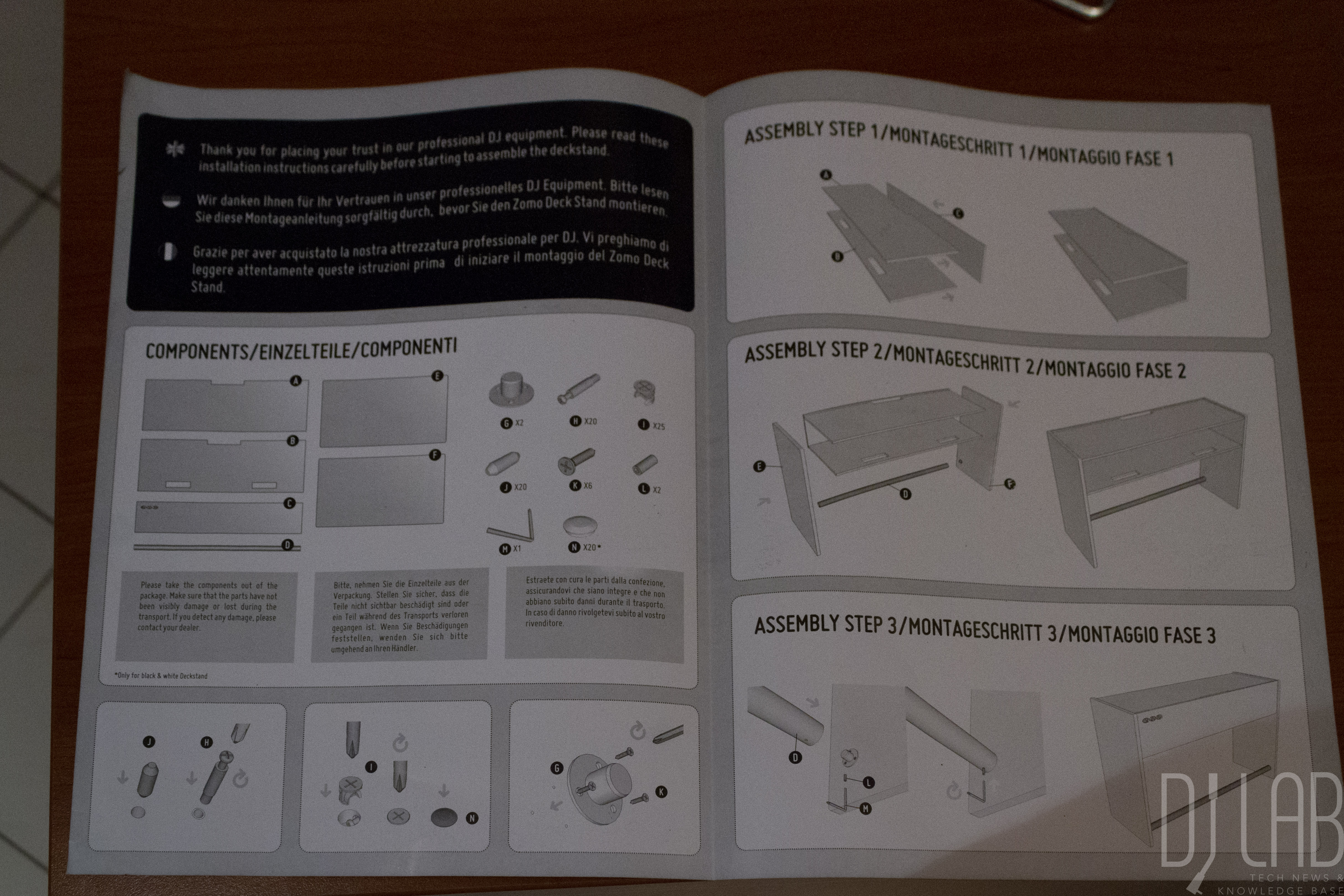 Die insgesamt fünf Teile des Tischs, samt Verbindungsstange und Schrauben, kommen in zwei großen Paketen daher. Ein erster Blick in die Aufbauanleitung wirkt vorerst beruhigend. In nur drei Schritten soll unser neues DJ-Pult also in voller Pracht erstrahlen... Challenge Accepted!