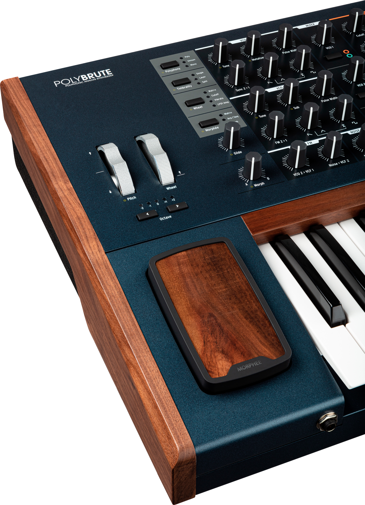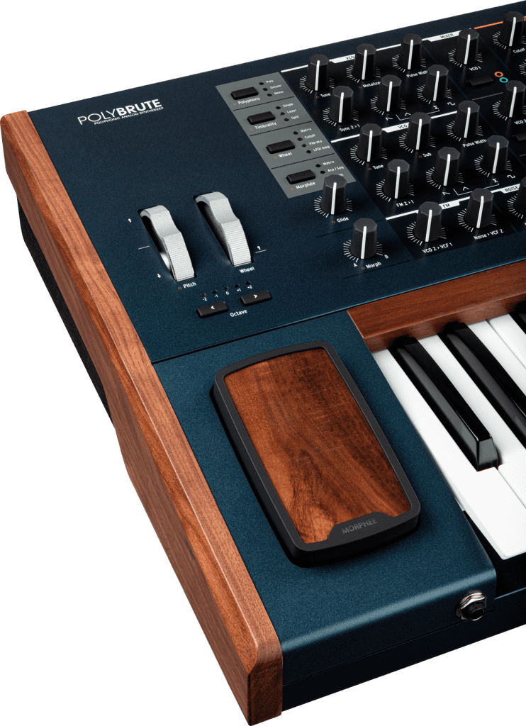 Da sich der PolyBrute unter anderem als Performance-orientiertes Instrument versteht, dürfen auch die expressiven Spielhilfen nicht zu kurz kommen. Pitch- und Modwheel sowie Aftertouch und Glide sind von anderen Synths bekannt. Der Ribbon Controller ist da schon unorthodoxer und wird durch Berührung ausgelöst. Der sogenannte Morphée wiederum ähnelt auf den ersten Blick einem herkömmlichen Touchpad mit variabler X- und Y-Achse, allerdings lässt sich hier zusätzlich die Z-Achse durch Herunterdrücken des Holzpanels manipulieren. Somit können drei unabhängige Parameter gleichzeitig kontrolliert werden.