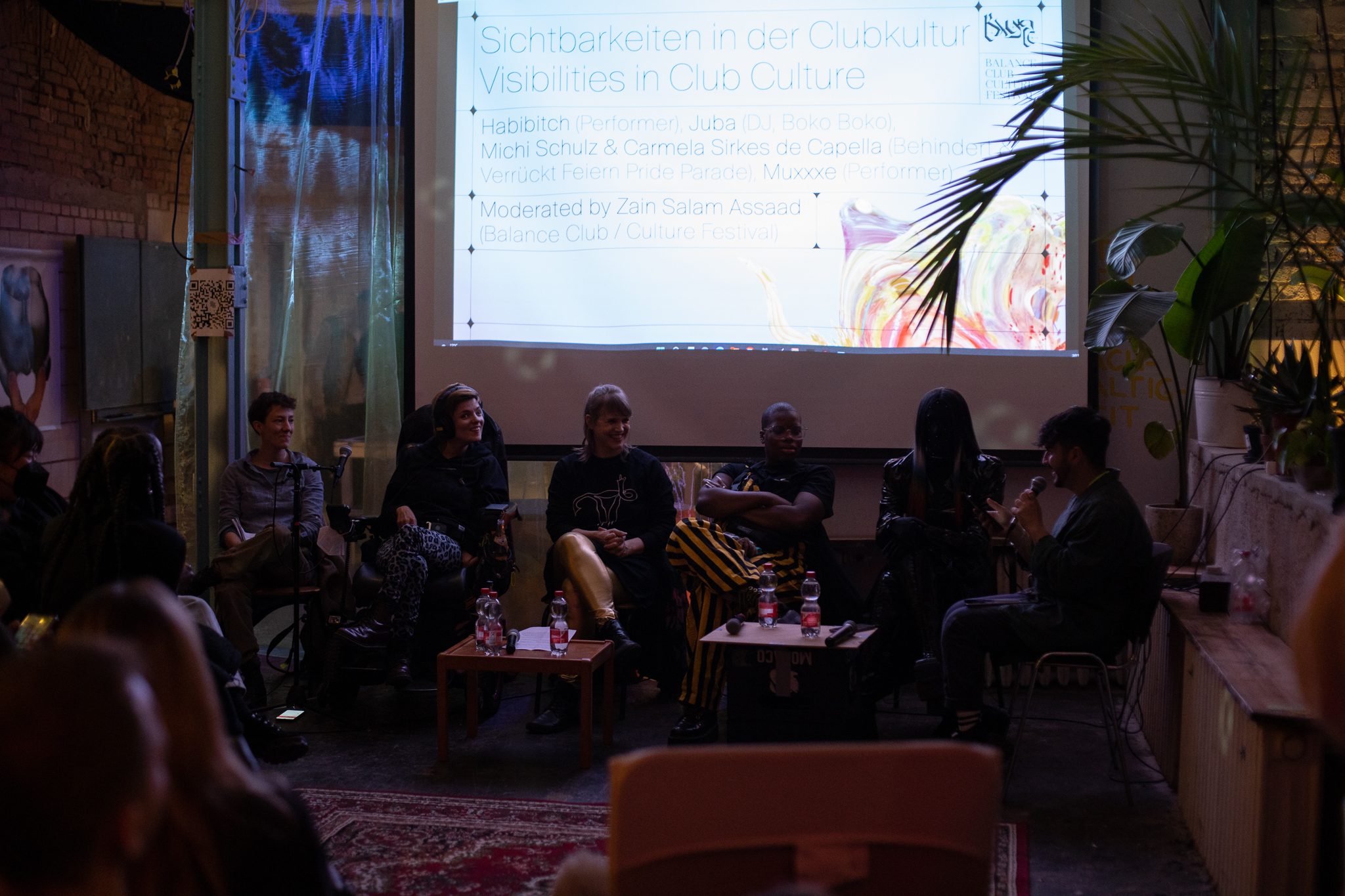 Samstag auf dem Balance Festival. Ein Panel, das sich intensiv und konkret mit dem Festivalmotto „In:Visibilities“ auseinandersetzt, vereinte vier Akteur:innen der Clubkultur und Autor Zain Salam Assaad unter dem Claim „Sichtbarkeit in der Clubkultur“. Schwarze, nicht-binäre, „behinderte und verrückte“ Perspektiven in Clubs, zu Machtverhältnissen und Repräsentanz wurden mit Performer:in Muxxxe, DJ Juba und Michi Schulz sowie Carmela Sirkes de Capella, die sich beide für inklusives Feiern engagieren, vorgestellt und diskutiert.