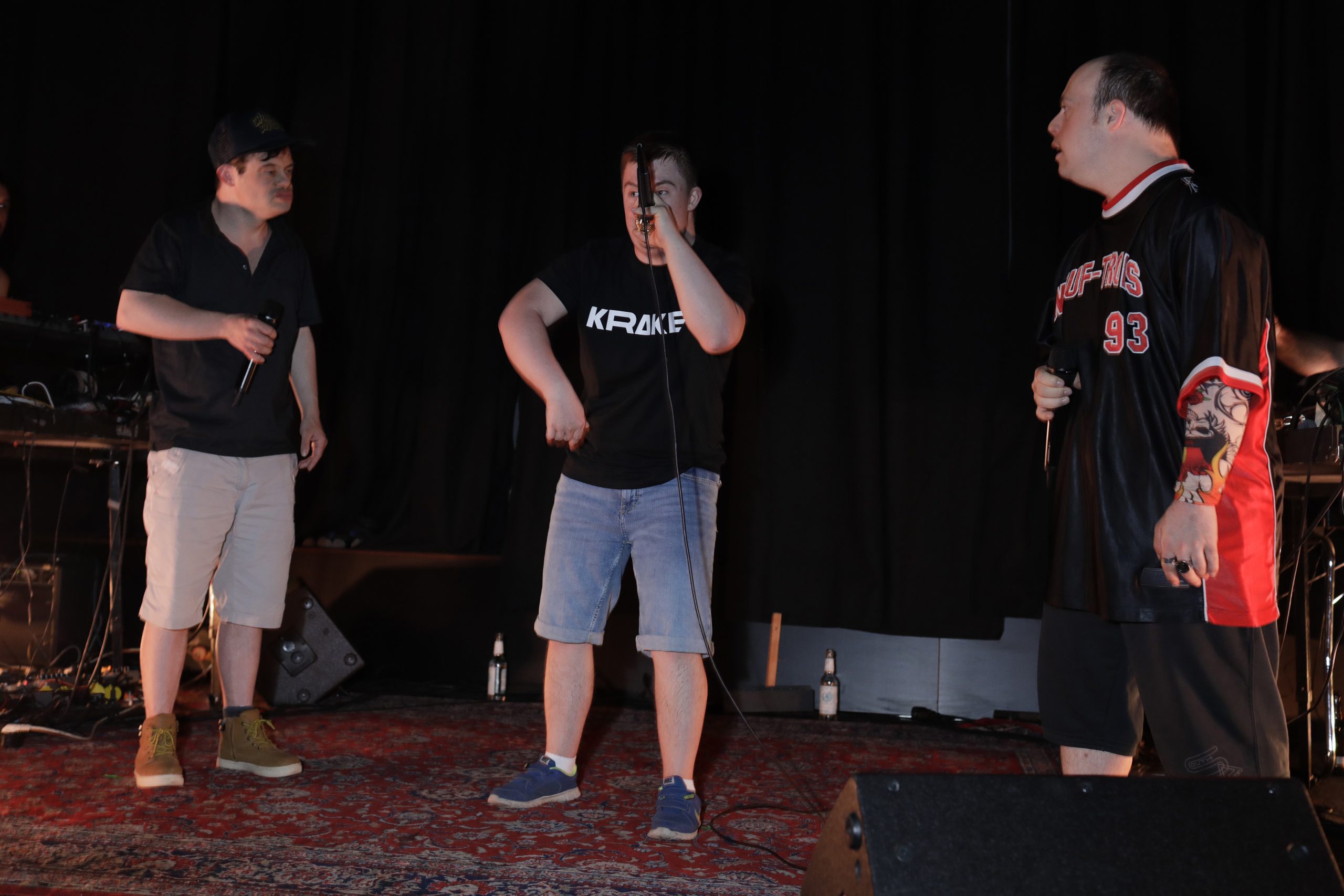 Bemerkenswert ist all das höchstens, weil es in seiner Banalität eine Ausnahme bildet: Die Berührungsängste mit dem Thema Behinderung sind groß, es will ja niemand etwas Falsches sagen oder tun. Das ist verständlich, aber diese Art von Scheu ist deshalb eine falsche, weil sie den Ausschluss nur befördert. Meistens finden sich im Publikum von inklusiven Veranstaltungen Menschen, die mit dem Thema irgendwie persönlich zu tun haben. Auch das ist so ein Teufelskreis, der durchbrochen werden muss. Die belgische Gruppe Choolers Division zeigt ein bisschen, wie es gehen könnte. Mit knarzigem Noise-Rap à la Anticon etwa, hin und wieder garniert von Acid-Spritzern oder einem Dembow-Rhythmus. Dazu machen zwei MCs eine Show und gehörig Laune.