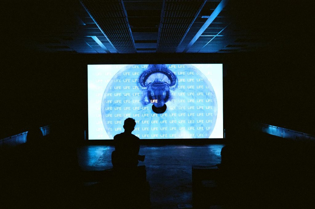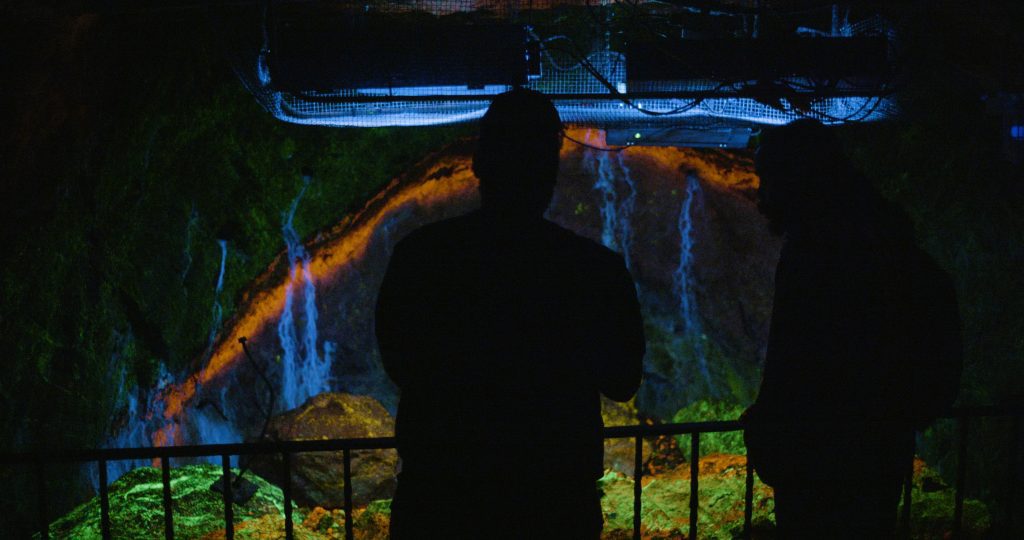 Es markierte auch das Ende der festgelegten Route, die zuletzt in den Hauptraum des Kraftwerks führte und dort zur Ver- und aber auch Zerstreuung einlädt: Die Gäst:innen konnten frei von Station zu Station, von einer Installationsarbeit hin zum nächsten skulpturalen Gebilde strömen, in einem ehemaligen Pausenraum – es hingen tatsächlich Arbeitshelme an der Wand – einen Film über chinesische Arbeiter:innen anschauen oder im vormaligen Kontrollzentrum die von durchdringenden, sich ständig in Bewegung befindlichen Scheinwerfern in Rot und Grün nur ausschnittsweise beleuchteten Armaturen bewundern.