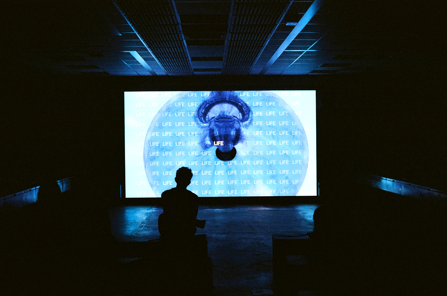Drinnen präsentiert sich heute |||||||||||||||||||| zum ersten Mal live. Auf eine Art zumindest, denn statt einer Bühne sind lediglich Projektionen zu sehen, die auf einer großen Leinwand und den Wänden der Halle flimmern. Musikalisch bewegt sich das Set durch die Bereiche der UK-Sounds der neunziger Jahre, greift hier Ambient-Techno-Formeln auf, erinnert dort an den klassischen Warp-IDM oder rückt gar in die Bereiche von Trip-Hop vor. Doch der Sound ist komplex und vielschichtig, modern und geschickt ausproduziert. Die Musik wäre aber nicht halb so beeindruckend, würde die ungewöhnliche Konzertsituation – am Ende gibt es schallenden Applaus für einen Screen – nicht die audiovisuelle Erfahrung verstärken. Wieder wird der Raum zum Verstärker der Erfahrung.
