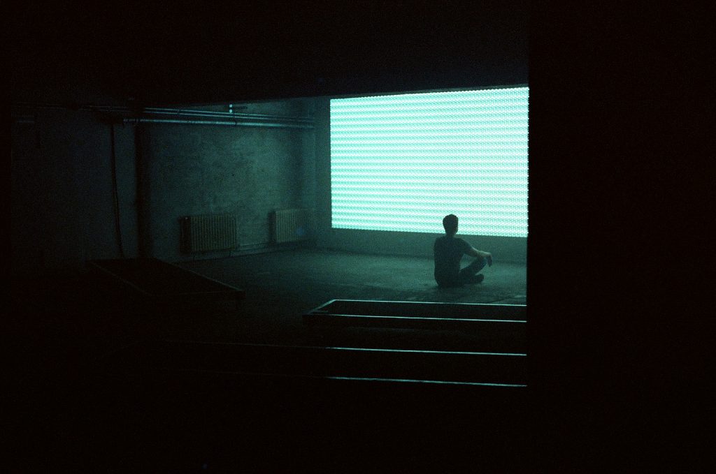 Wer an einer Führung durch die Ausstellung teilnahm, wurde zuerst in den Tresor geführt. Der ikonische Neonschriftzug über dem Eingang war dann allerdings für eine weite Strecke die einzige Lichtquelle, die den Weg beleuchtet, denn durch den Tunnel hin zum Floor ging es durch beinahe absolute Dunkelheit. Vorsichtig setzten die Besucher:innen einen Schritt vor den anderen, rempelten dann doch wieder ineinander, murmelten einander Entschuldigungen zu. Fast hat es den Anschein, als habe auf dem Weg zum Dancefloor nach anderthalb Jahren Stillstand die Clubsituation simuliert werden sollen.