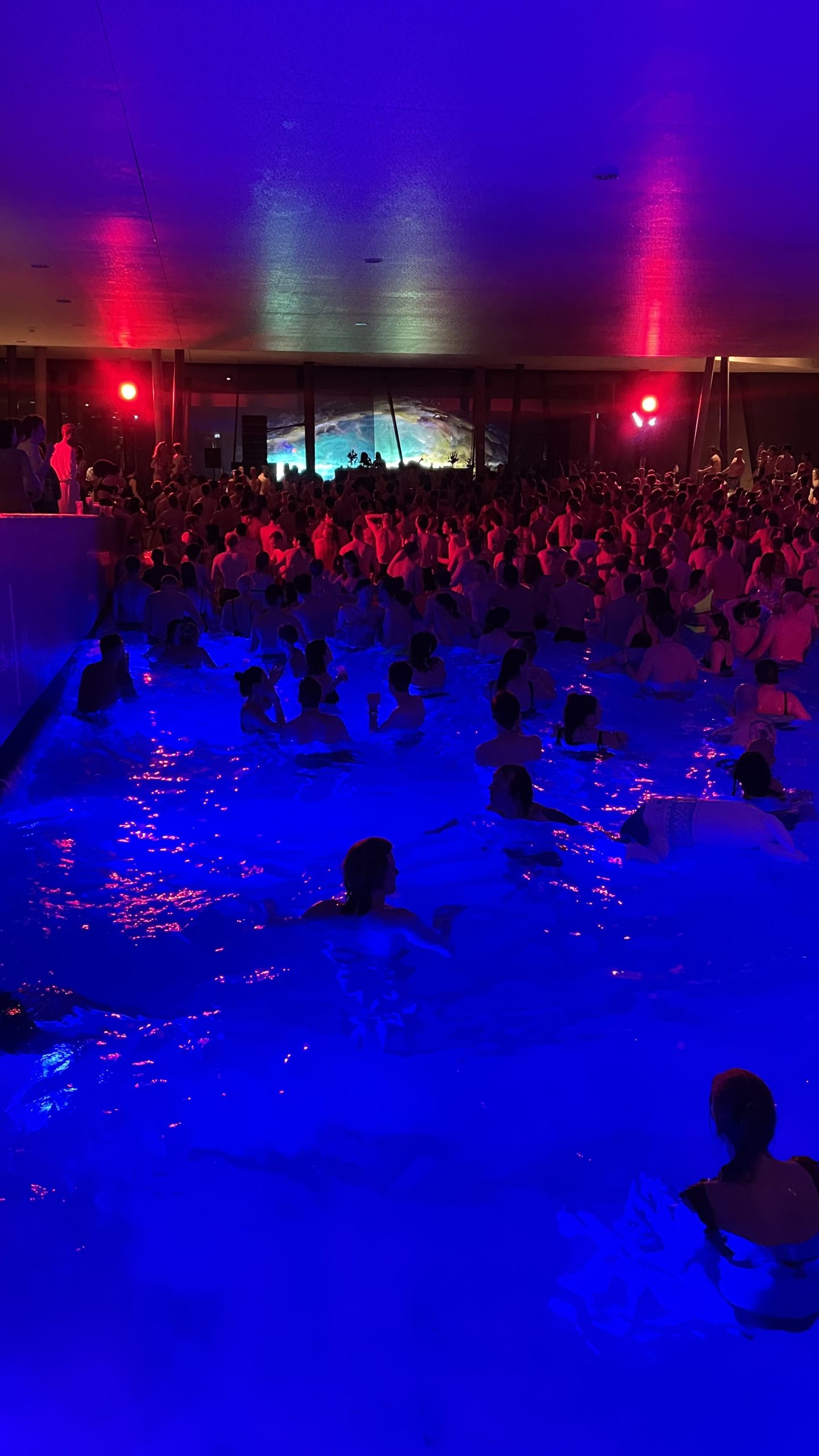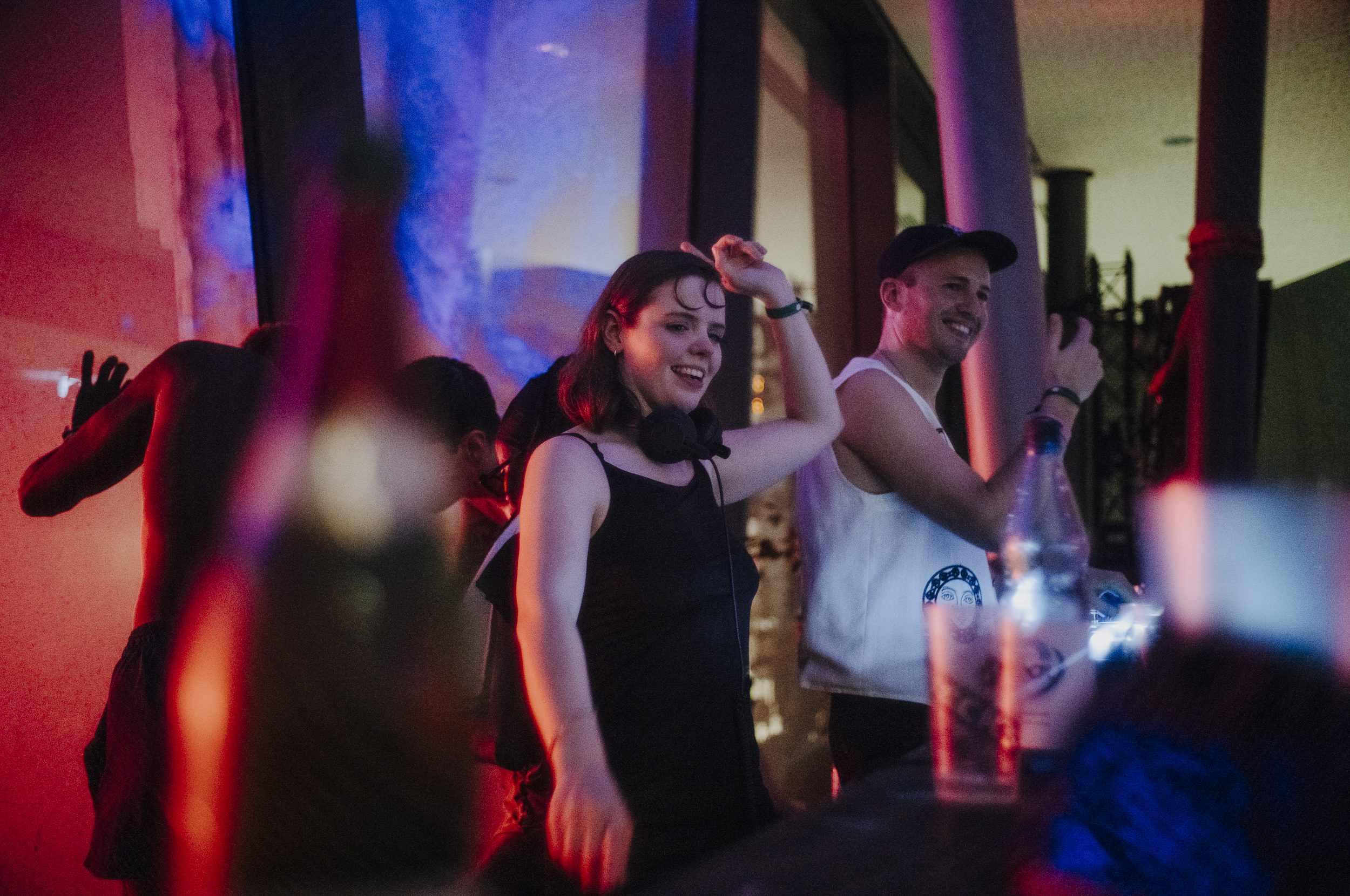 Im Wasser wird getanzt, Limo und alkoholfreies Bier getrunken, getaucht, geknutscht und geschwommen – die, die drin sind, haben eine unfassbar gute Zeit. Bademeister und Security schauen ohne Pause auf die Leute im Pool. Vor dem Bad sichert die Security zusätzlich den Durchgang, die Kapazität ist längst erschöpft. Dumm nur: Die Leute sind umgezogen, stehen weniger als 20 Meter vom Becken entfernt. Rein ins Wasser kommt man aber nur noch, wenn eine andere Person den Floor verlässt. Manche hoffen noch, andere treten sauer den Rückweg an. Alle anderen Locations sind ebenfalls voll – irgendwas hat hier bei der Kalkulation nicht hingehauen. Große Freude und Frust liegen bei diesem Festival am letzten Tag beklemmend eng beisammen.