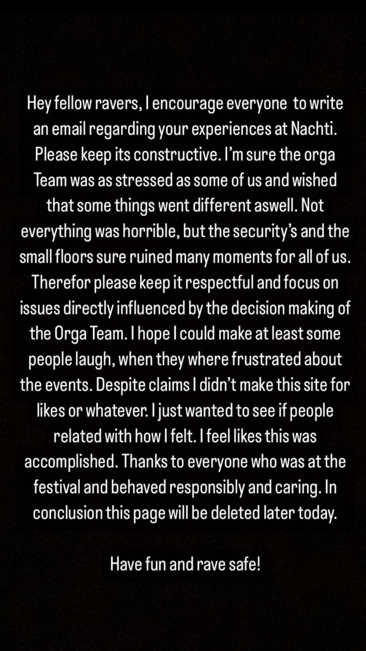 Es wurden daraufhin extreme Drogenkontrollen durch die Secus vor Ort durchgesetzt, wie manche berichten. Awareness-Team, safer use policy? Nicht vorhanden. Angeblich gab es Safer-Clubbing-Personen, präsent waren sie nicht. Eine eigene Memeseite verarbeitet das Erlebte bei Instagram, wurde wenige Tage später aber gelöscht.