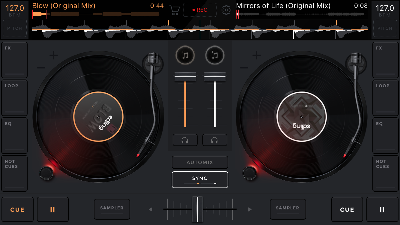 edjing Mix wirbt mit einem erweiterten Musikmanagement, bei dem man Musik vom eigenen Gerät oder aus einer Cloud (z. B. Google Drive, Dropbox, iCloud) laden kann. Zudem lassen sich auch Streaminganbieter wie Tidal oder SoundCloud nutzen. Die Oberfläche der App ist dabei sehr aufgeräumt, das Zentrum bildet ein Zwei-Deck-Mixer, der zwischen zwei virtuellen Turntables sitzt. Hot Cues, EQs, Smart EQs (zum Separieren von Vocals, Percussions und Instrumenten), Loops und ein paar Effekte sind im direkten Zugriff ebenfalls erreichbar. Obendrauf bekommt man einen kleinen Sampler, der durch In-App-Käufe mit Sample-Paketen gefüllt werden kann.