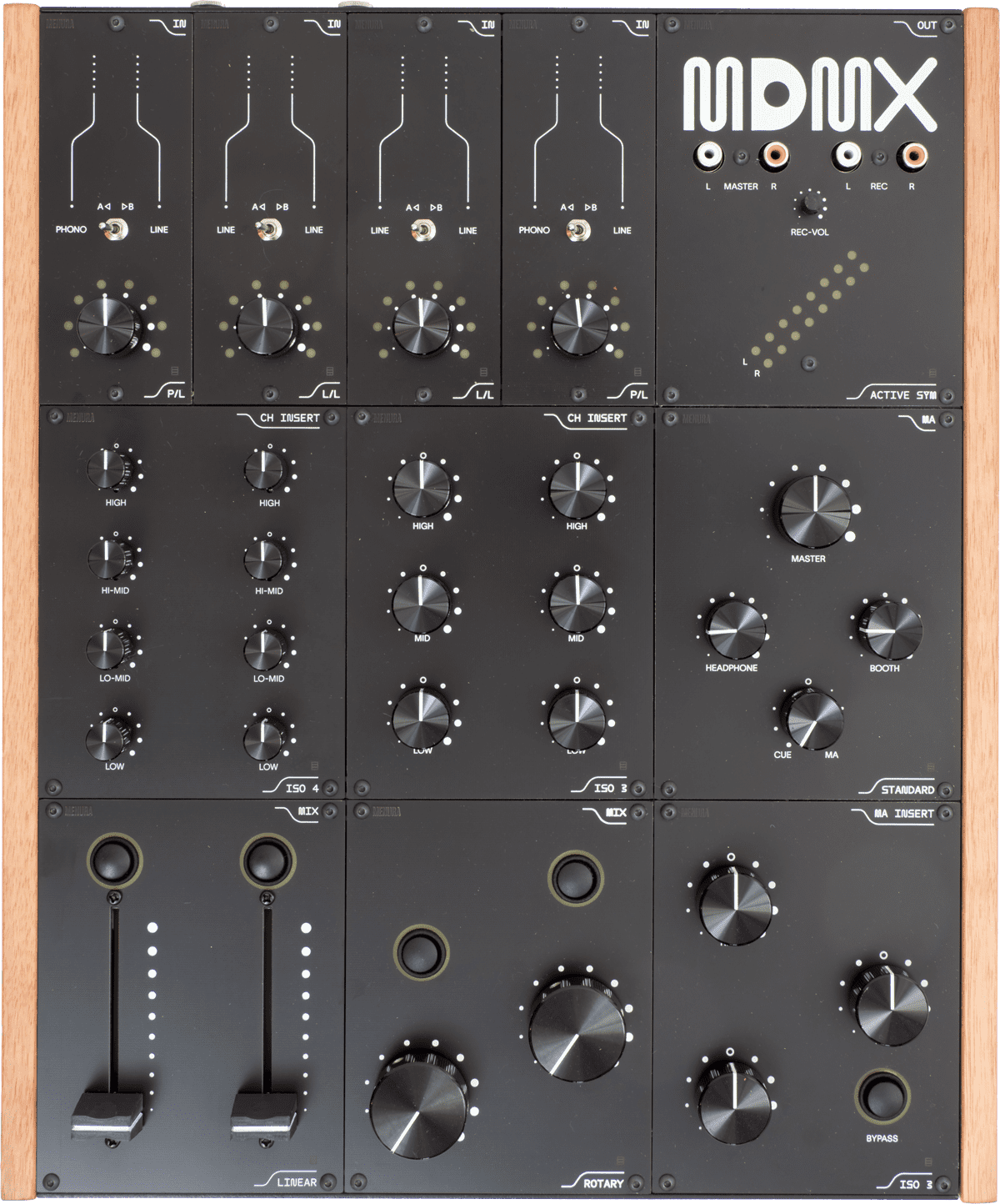 Der Menura Audio MDMX ist ein modularer Vierkanalmixer, dessen Basis ein robustes, schwarzes Metallgehäuse mit Seitenteilen aus Holz ist, das 393 x 328 x 85 mm misst und circa 5,8 Kilogramm wiegt. Die Optik erinnert an analoge Kultsynthesizer von Moog oder Sequential Circuits und auch die robuste Beschaffenheit weiß zu gefallen. Das Gehäuse ist mit einer Reihe an Anschlüssen versehen und bietet Montageschienen für unterschiedliche Module. Bereits beim Kauf kann eine individuelle Bestückung mit Eingangs-, Kanal-, Mixer- und weiteren Modulen gewählt werden. Somit erwirbt man nicht, wie gewöhnlich, ein vom Hersteller zusammengestelltes Produkt, sondern konfiguriert es gleich zu Beginn nach den eigenen Bedürfnissen. Spätere Umbauten durch alternative Module sind natürlich jederzeit möglich und auch im Falle eines Defekts kann man das entsprechende Modul statt eines ganzen Geräts nachkaufen – super!