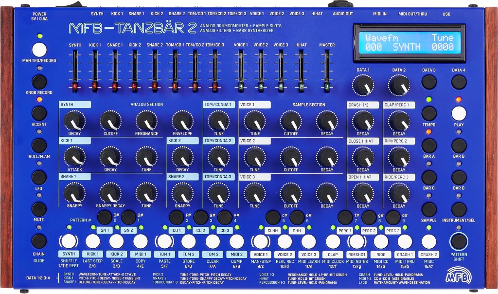 Der Tanzbär 2 (hier im Test) des Berliner Herstellers MFB überzeugt vor allem durch seinen fetten Sound. Es ist erstaunlich, wie viele brauchbare Kicks allein mit Decay und Pitch erzeugt werden können – die analogen Instrumente des Bären haben jede Menge Druck und einen angenehm organischen Klang. Die digitalen Sounds hingegen überzeugen durch ihre Vielseitigkeit und bilden die perfekte Ergänzung zur Klangpalette. Die Möglichkeit, eigene Samples mit einer Maximallänge von 300 ms in die Kiste zu Laden ist großartig gelöst und lässt die Bezeichnung Drumcomputer zur Untertreibung werden.