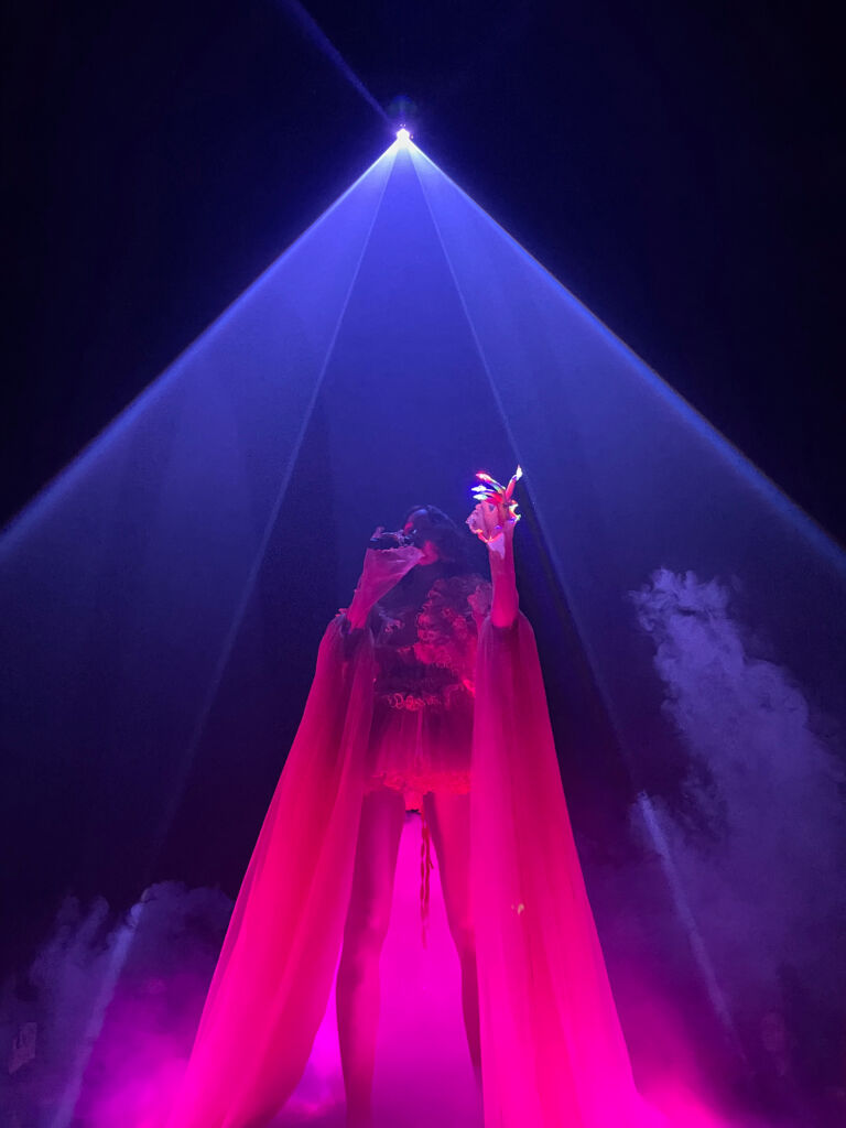 VōX ist an diesem Abend auf eine Art die sichtbarste Person, die mehrmals auftaucht, in einem fließenden Kleid, angestrahlt und emporgehoben von weißem, dichten Nebel. VōX bildet damit einen Fluchtpunkt im Kraftwerk, dem man sich zuwenden kann. In einem Meer von Laserstrahlen und Licht wird man abgesehen von den Gesangsauftritten als Besucher:in nämlich selbst zum Zentrum, umgeben von Licht und Sound, vor und hinter sowie über dem eigenen Kopf. Nach einigen Versuchen gebe ich das Fotografieren auf, denn es lässt sich nicht annähernd abbilden oder einfangen, was an diesem Abend im Kraftwerk visuell passiert.
