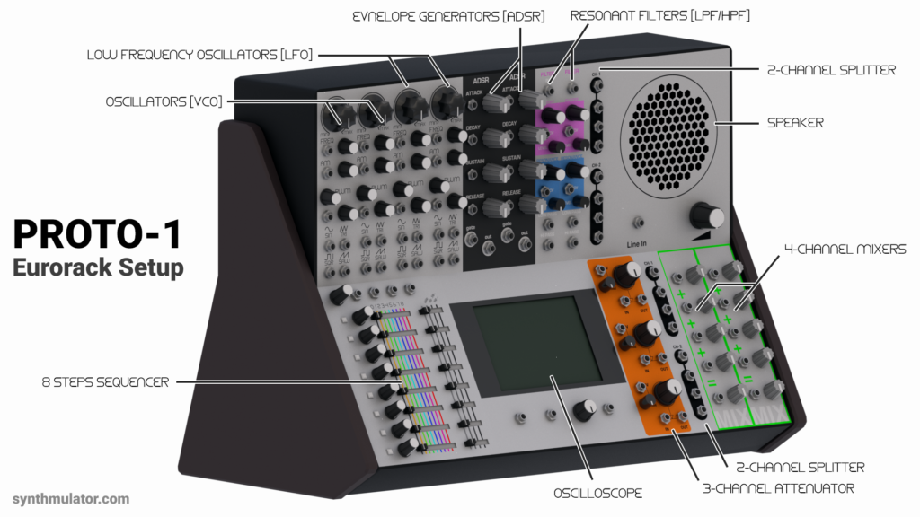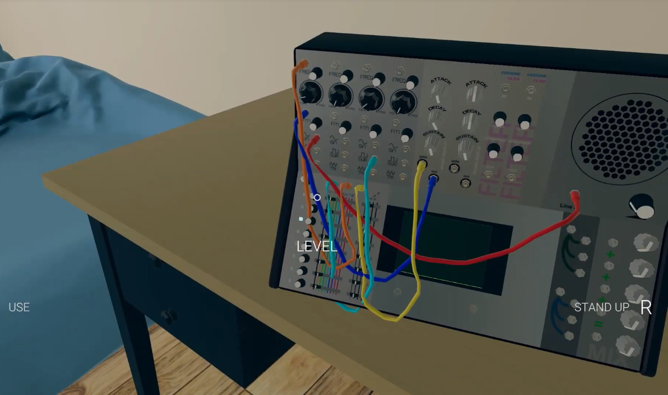 Dieser ist stilecht geschmückt mit den Plattencovern von Giorgio Moroders 'From Here To Eternity' und 'Oxygene' von Jean Michel Jarre, mehr Inspiration um in der virtuellen Realität eigene Patches zu kreieren geht nicht. Zentrum des Spiels ist dabei der PROTO-1 Synthesizer, an dem eigene Patches via Maus und Tastatur einprogrammiert werden können. Der Eurorack-Synth ist bestückt mit folgenden Modulen:
