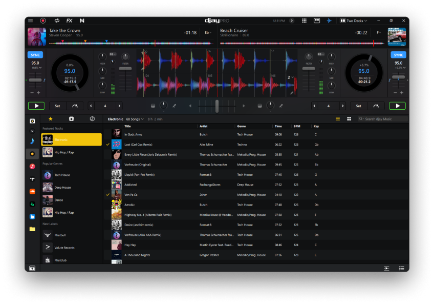 Bis zu vier virtuelle Decks stehen zur Verfügung, die auch Infos wie Zeit- und Trackverlauf, BPM, Tonart und Tonhöhe bereitstellen. Eigene Playlists können erstellt und über die Suchfunktion schnell wiedergefunden werden. Und über MIDI-Learn ist es möglich, weitere Controller ins Live-Set mit einzubinden.