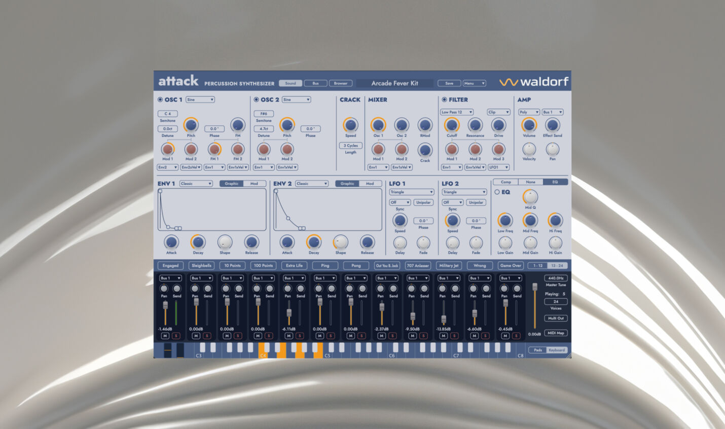 Der Klassiker aus der Welt der elektronischen Percussion-Synthese ist zurück: Mit Attack 3 präsentiert Waldorf ein Software-Instrument, das traditionelle Drum-Sounds mit aktuellen Produktions- und Modulationsfunktionen vereint.