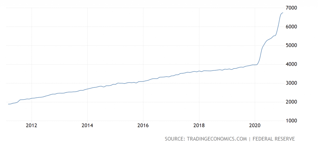 Kryptowährungen kommen immer mehr im Mainstream an. Nach einer längeren Durststrecke erfährt der Markt um Bitcoin ein Hoch nach dem anderen. Das hängt vor allem mit dem steigendem Interesse von institutionellen Anleger*innen und Unternehmen zusammen. Ob als Inflationsschutz gegen das Gelddrucken in Krisenzeiten – 2020 wurden 40 % aller sich im Umlauf befindenden US-Dollar gedruckt (siehe Bild) – oder als alternatives Peer-to-Peer-Zahlungsmittel, Kryptowährungen werden für immer mehr Anleger*innen zu einer Alternative.