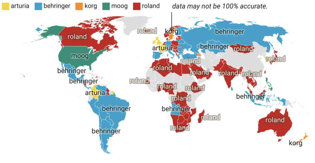 Weltkarte zeigt die beliebtesten Synthesizer-Marken nach Ländern